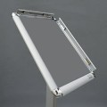 Tablica zatrzaskowa typu OWZ z profilu aluminiowego o szerokości 25 mm, wykończona plastikowymi zaokrąglonymi głowicami narożnymi. Rama dostępna w kolorze srebrnej anody. Produkt wyposażono w elastyczną folię antyrefleksyjną z filtrem UV o grubości 0,5 mm, która tłumi refleksy światła, chroniąc plakat przed blaknięciem. Tylna ściana wykonana z trwałego i odpornego na pęknięcia materiału. Do nadruku grafiki polecamy użycie papieru plakatowego 150 g.